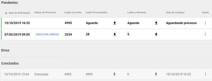Aguarde até o processamento seja finalizado. Após isso atualize a página e na tela inicial de limpeza de lista você pode ver todas as solicitações realizadas.