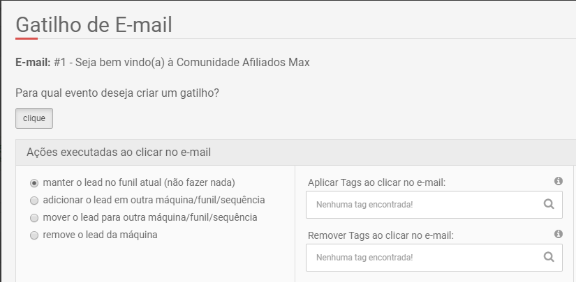 O gatilho de e-mail é configurado no funil e caso ainda esteja ativo poderá ser executado sempre que o lead fizer certa Ação (abrir e/ou clicar na mensagem). Sempre que um lead entrar na sequência com um Gatilho de E-mail ativo ele estará suscetível ao mesmo.