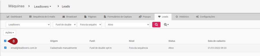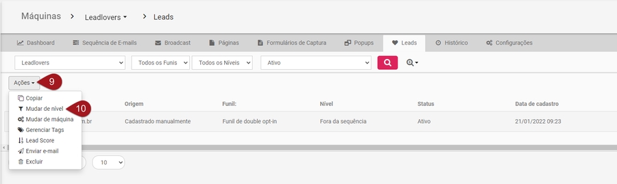 Nº12– Selecione o Nível na opção “Sequência”, ou seja, em qual e-mail deste funil o contato será posicionado.