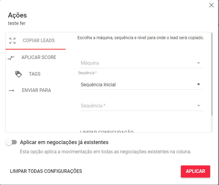 3 – Quando um cartão entrar nesta coluna, se ele estiver vinculado à um lead, esta ação cria uma cópia deste lead em uma máquina, funil e sequência da sua escolha.