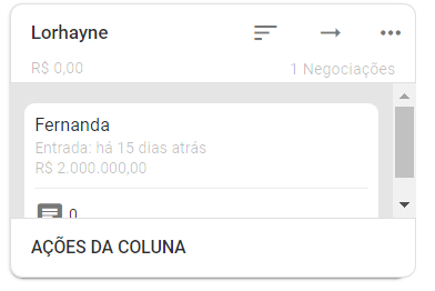Após a criação de uma nova negociação, o card aparecerá na coluna escolhida. Nesta visualização, você já pode ver: