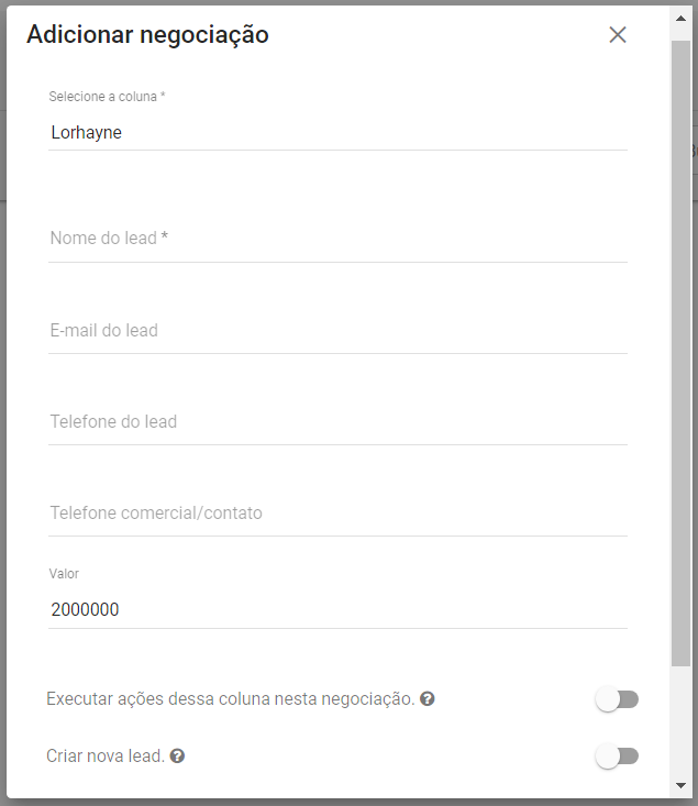 Criar um cartão manualmente não cadastra um lead em sua conta, e portanto não ativa as ações de coluna. Mas, caso o cartão seja cadastrado usando um e-mail de um lead que já está em sua conta, então ambos ficarão vinculados, e então as ações de coluna poderão agir sobre o contato.