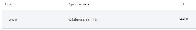 Nº8– Localize a entrada cujo Nome é www e confirme se os seus Dados, valor ou aponta para está com o seu domínio principal sem o www na frente. No nosso exemplo, está somente wikilovers.com.br: