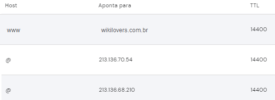 OBSERVAÇÃO: Nem todos os painéis de controle de Zona DNS solicitam a informação TLL. Caso o painel de seu domínio solicite, utilize o valor 14400.