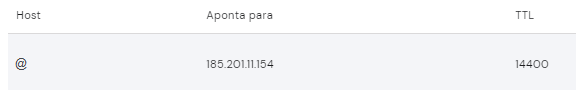Observação: Nem todos os painéis de controle de Zona DNS solicitam a informação TLL. Caso o painel de seu domínio solicite, utilize o valor 14400.