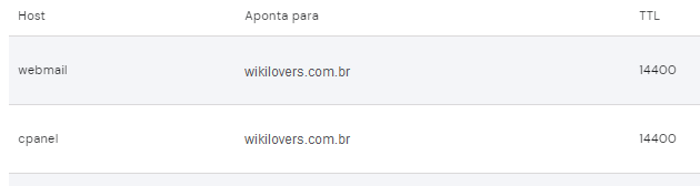 Exemplo: as entradas webmail e cpanel, do tipo CNAME, estão com o domínio principal (wikilovers.com.br) no campo “Aponta para”. Então salve o primeiro nome delas (webmail e cpanel).