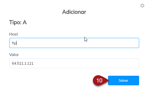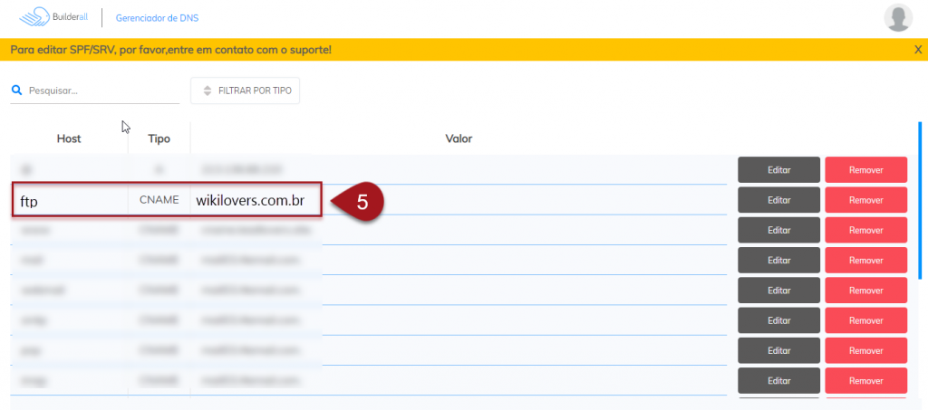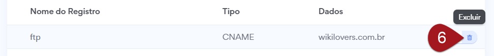 Exemplo: a entrada ftp, do tipo CNAME, está com o domínio principal no campo Valor. Então vou salvar o nome dela (ftp).