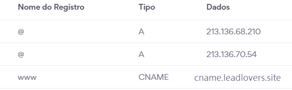 Agora sim, iremos fazer o apontamento do seu domínio para o nosso servidor. Atualmente, o apontamento para leadlovers é feito para 2 IPs.