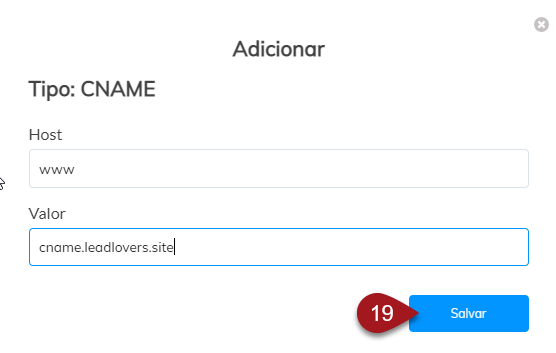 Host: neste campo, inclua o www (não inclua outros caracteres, letras, ou espaços em branco). Valor: neste campo, insira cname.leadlovers.site