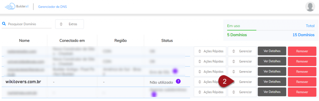 Nº2– Abrirá uma nova guia e nela terá uma lista com todos os domínios cadastrados por lá. Localize o domínio que deseja usar em sua máquina aqui no leadlovers e clique em Gerenciar.