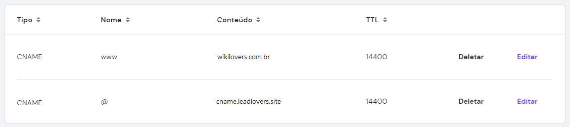 Ao final, você deve ter 2 entradas totais: 1 do domínio principal + 1 do www. As informações criadas ficarão similares às da imagem abaixo.
