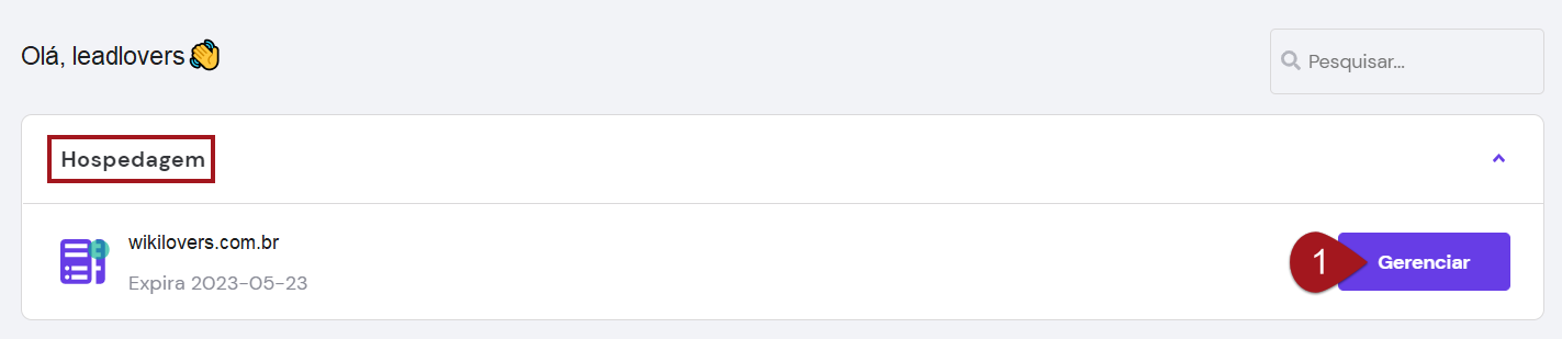 Nº1– Na parte de Hospedagem, localize o domínio que deseja usar em sua máquina aqui no leadlovers e clique no botão Gerenciar.
