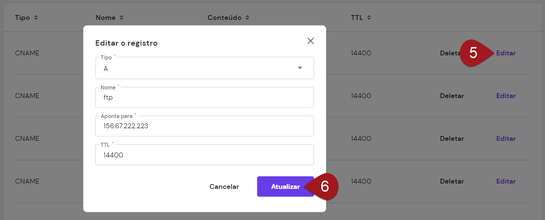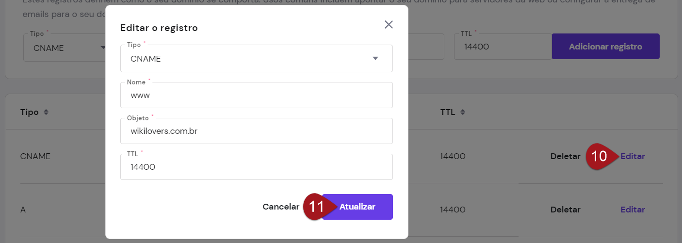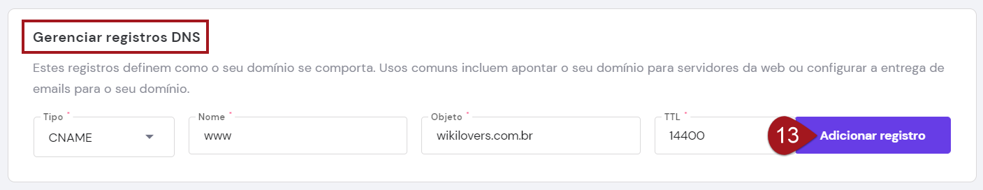 TTL: este campo virá automaticamente como 14400. Caso tenha alguma informação diferente, altere para 14400.