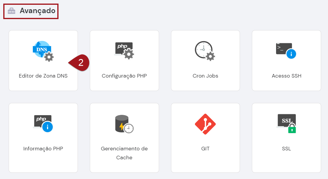Nº2– Localize o quadro da categoria Avançado. Dentre as opções disponíveis nele, clique sobre a opção Editor de Zona DNS.
