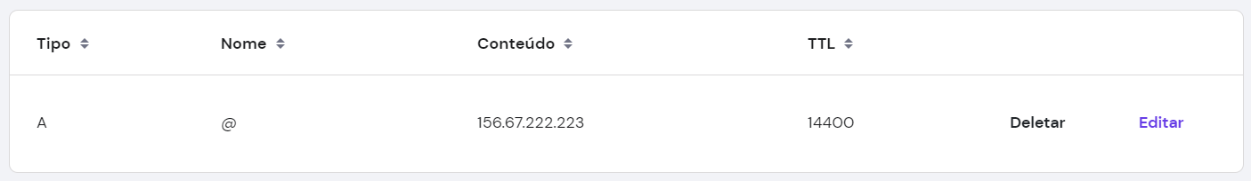 Exemplo: na imagem, a primeira entrada tem o Nome @ e é do tipo A. Ela está apontada para o número 156.67.222.223. Então, no caso do exemplo, salvarei este número.