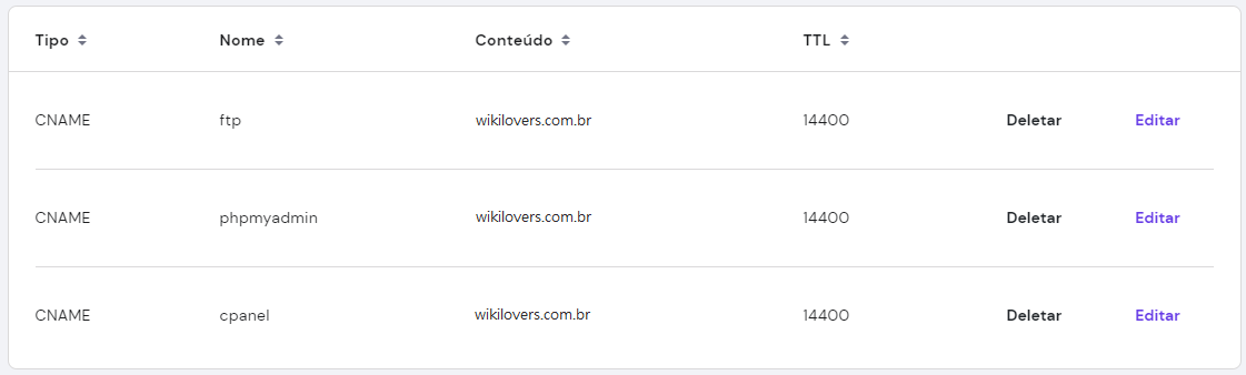 Exemplo: a entrada ftp, do tipo CNAME, está apontada para wikilovers.com.br