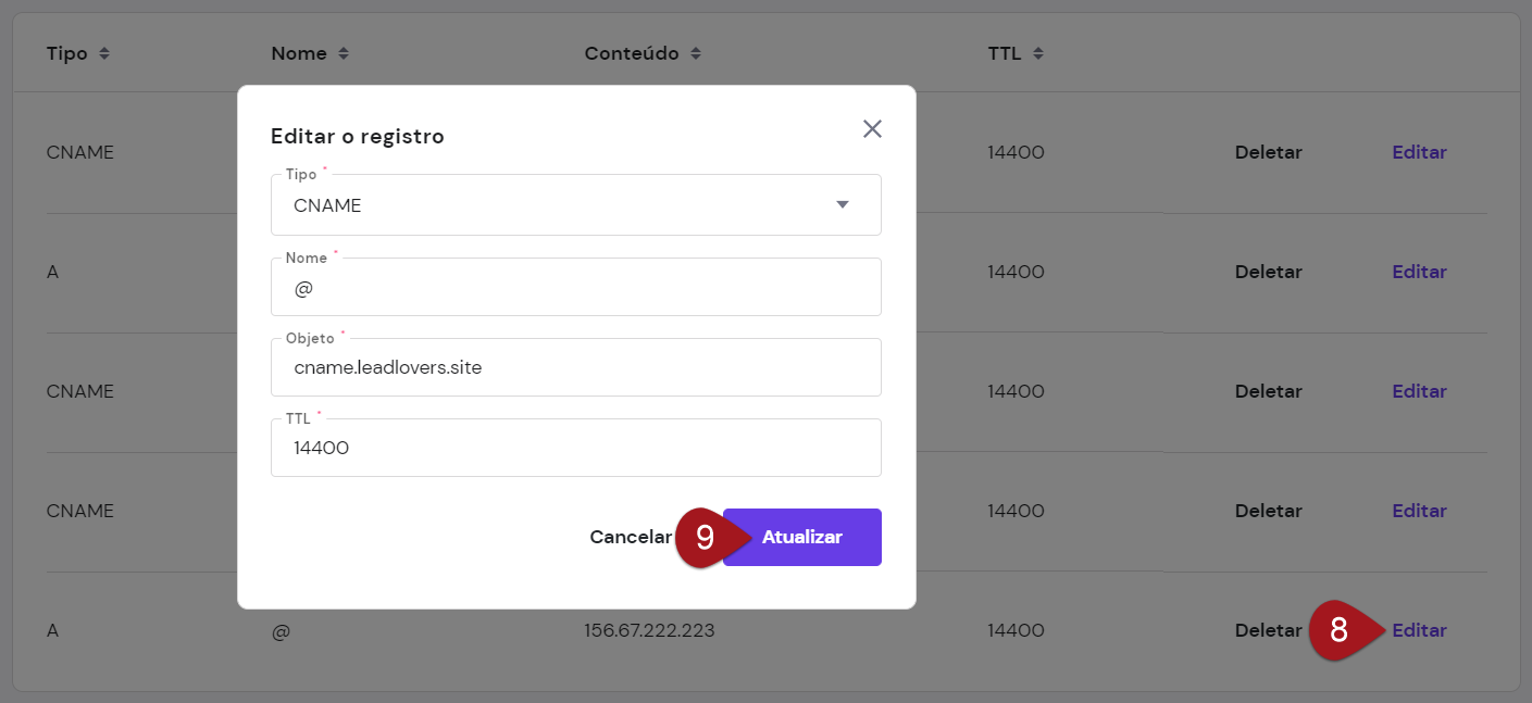 Vamos editar somente as entradas de CNAME que localizamos (você salvou o nome de todas elas, certo?) com as devidas informações, mas em um novo tipo.