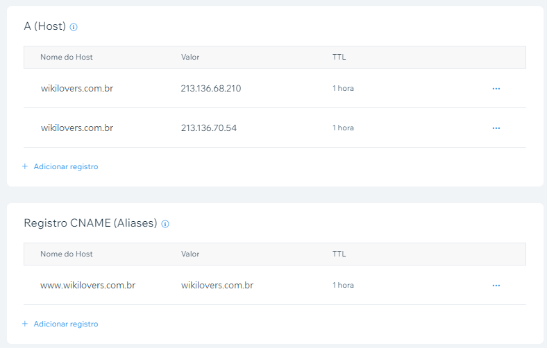 Ao final, você deve ter 3 entradas totais: 2 dos IPs + 1 do www. As informações criadas ficarão similares às da imagem abaixo.
