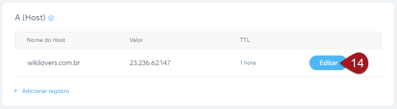Nº14– Localize a entrada do seu domínio principal, aquela do passo 05, passe o mouse em cima da mesma e clique no botão Editar.