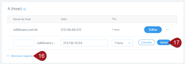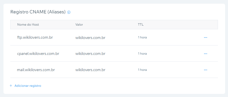 Exemplo: a entrada ftp.wikilovers.com.br, do tipo CNAME, está com o wikilovers.com.br (o domínio que estamos usando de exemplo). Então vou salvar o primeiro nome dela (ftp).