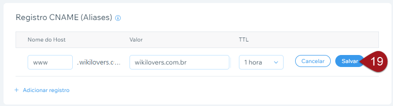 É preciso também fazer o apontamento da entrada de www. Assim, quem incluir estas letras na hora de digitar seu domínio no navegador, será direcionado normalmente para as suas páginas.
