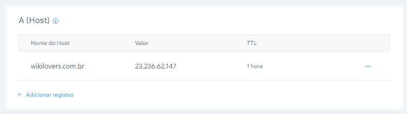 Exemplo: na imagem, a entrada wikilovers.com.br não tem primeiro nome. Ela está apontada para o número 23.236.62.147. Então, no caso do exemplo, salvarei este número.