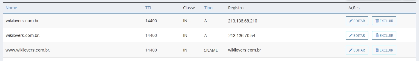 Ao final, você deve ter 3 entradas totais: 2 dos IPs + 1 do www. As informações criadas ficarão similares às da imagem abaixo.