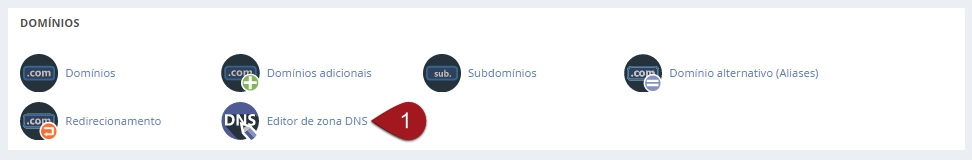 Nº1– Localize o quadro da categoria Domínios. Dentre as opções disponíveis nele, clique sobre a opção Editor de zona DNS.