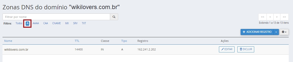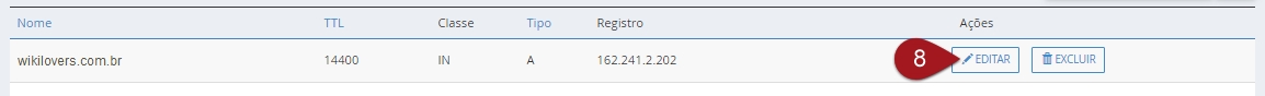 Exemplo: na imagem, a entrada wikilovers.com.br é do tipo A e não tem primeiro nome. Ela está apontada para o número 162.241.2.202. Então, no caso do exemplo, salvarei este número.