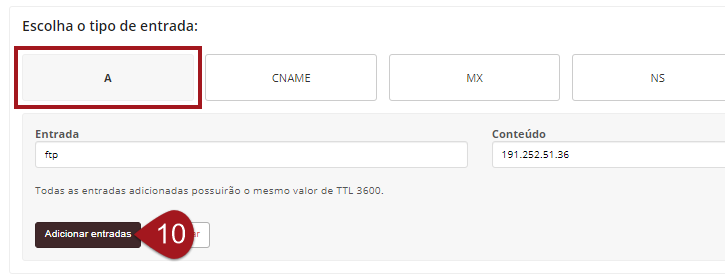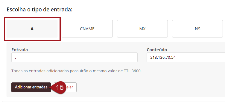 Nº14– Depois que salvar a entrada anterior, crie uma nova no botão Adicionar Entrada que fica em cima da zona DNS.