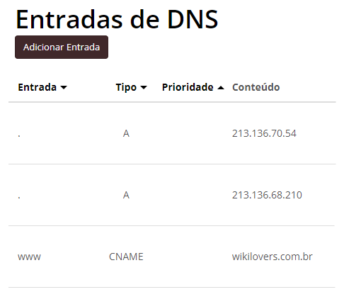 Ao final, você deve ter 3 entradas totais: 2 do domínio principal + 1 do www. As informações criadas ficarão similares às da imagem abaixo.