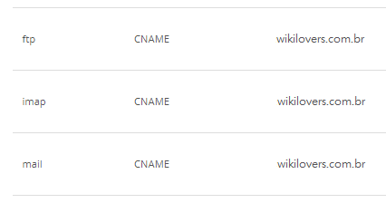 Exemplo: a entrada ftp, do tipo CNAME, está apontada para wikilovers.com.br (o domínio que estamos usando de exemplo). Então vou salvar o Nome dela (ftp).