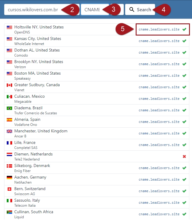 Nº5– Se a pesquisa retornar todas as localidades com o nosso domínio cname.leadlovers.site e a grande maioria delas estiver com um check verde (✅), isso significa que os seus apontamentos propagaram.