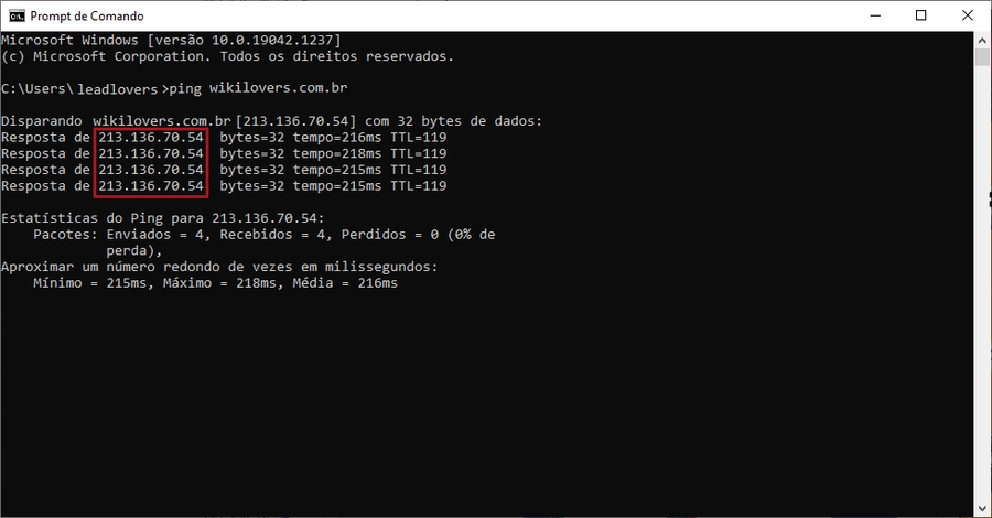 Nº4– Já com o Prompt de Comando aberto, escreva: ping seudominio.com.br, substituindo a informação “seudominio.com.br” pelo domínio que você deseja fazer a consulta. No nosso exemplo, escrevemos: ping wikilovers.com.br.