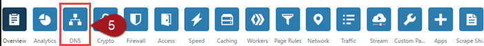5 – Depois, localize na parte superior da tela um conjunto de ícones azuis, como este da imagem. Clique sobre a opção DNS.