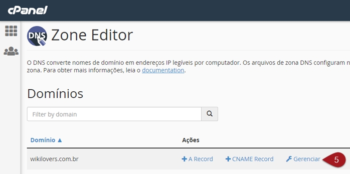 5 – Agora, você está na lista de domínios gerenciados por este Cpanel. Procure o qual você deseja usar para seu subdomínio e clique em Gerenciar (no exemplo, vamos usar o wikilovers.com.br).