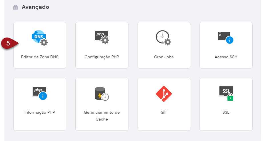 5 – Localize o quadro da categoria Avançado. Dentre as opções disponíveis nele, clique sobre a opção Editor de Zona DNS.