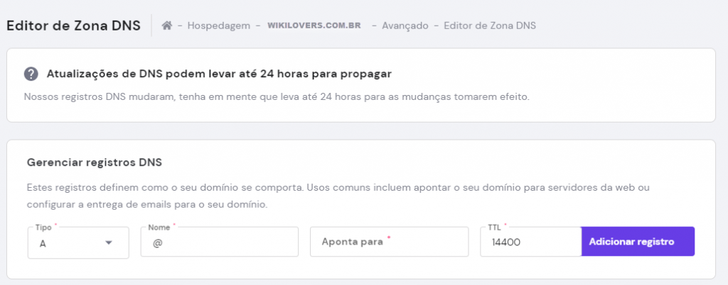 EXEMPLO: se quero que minha entrada de subdomínio seja click.wikilovers.com.br, o nome da entrada que estou criando tem que ser click