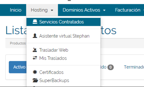 4- No menu de navegação do site, na parte de Hosting clique em Servicios Contratados.