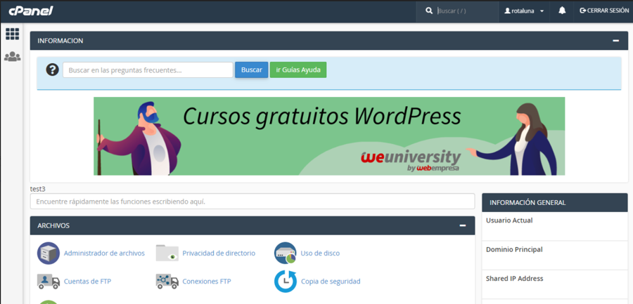 6- Na tela de informações sobre o seu domínio role para baixo até localizar a parte de Información de Alojamiento então clique para Acceder a Cpanel.