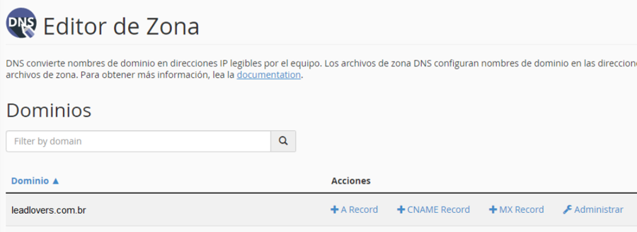 Dentro da próxima tela, você vai ver diversas entradas já criadas. Este é o local onde editamos as informações da Zona DNS de seu domínio.