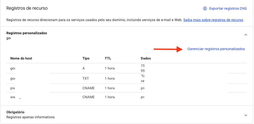 As etapas da configuração podem variar conforme o serviço de domínio ou provedor utilizado. Ao fazer a configuração, tome cuidado para não apagar ou sobrescrever nenhuma das entradas já existentes.