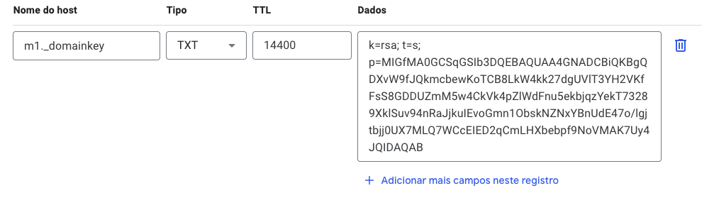 Em Dados, coloque v=DKIM1; k=rsa; p=MIGfMA0GCSqGSIb3DQEBAQUAA4GNADCBiQKBgQDt3un6gterEBhg9krK3rueyzEx8RG6TgFFsje34tzVlwDWKA3ywKWSiqx5rNSP/2G4jwUVKe0PIWRK9+GPnXBPMD2a+dVxcLA/EgPoXSQGAJX+0OHf2Il83DxgQfjfKn7MLUM1WLdwhRJ8EGWeN6E35AeFrW9++y0+y3c2BqXuaQIDAQAB;