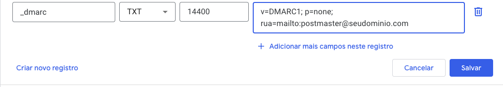 Dados: v=DMARC1; p=none; rua=mailto:postmaster@seudominio.com