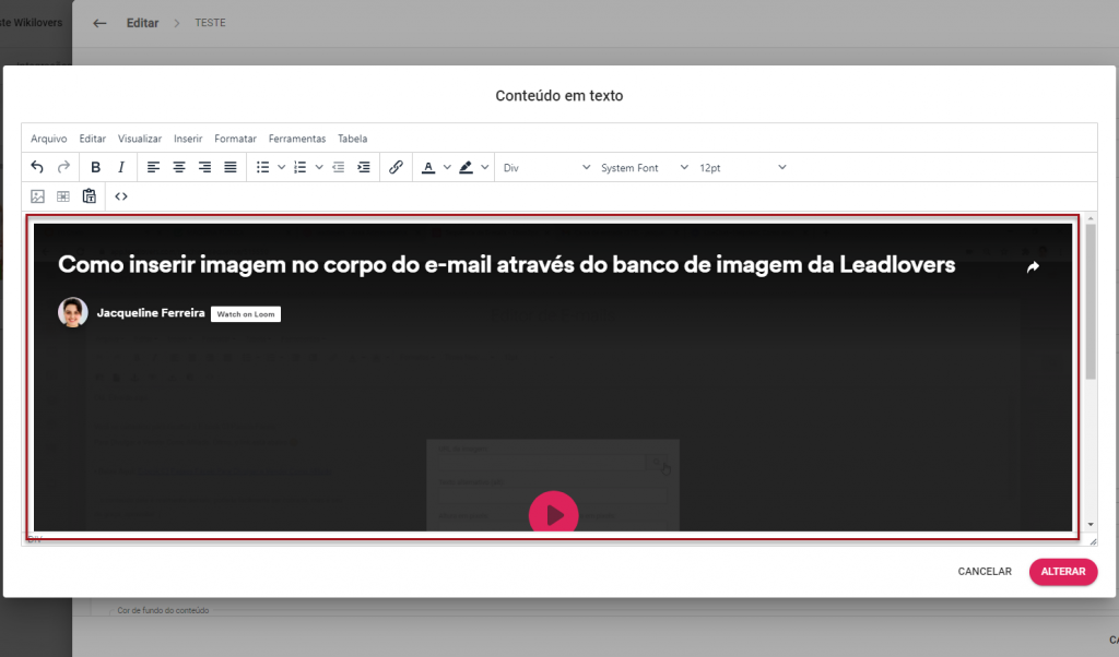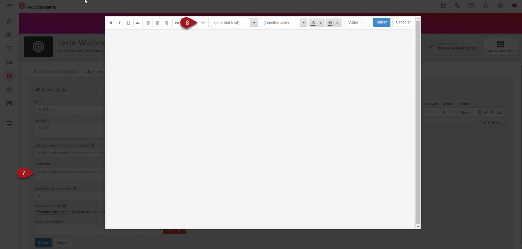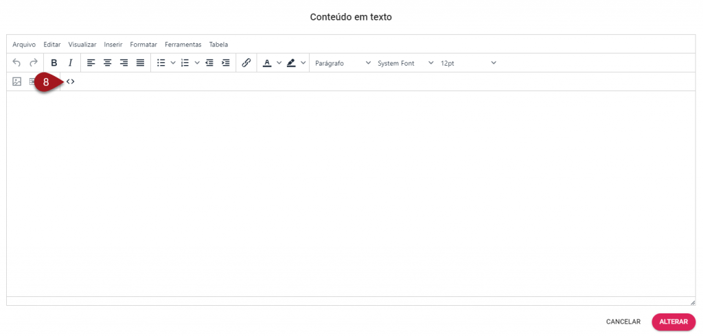 8 – Uma janela se abrirá. É aqui que você realizará as edições referentes do conteúdo da aula. Para inserir um vídeo de uma plataforma externa, clique no ícone de código.