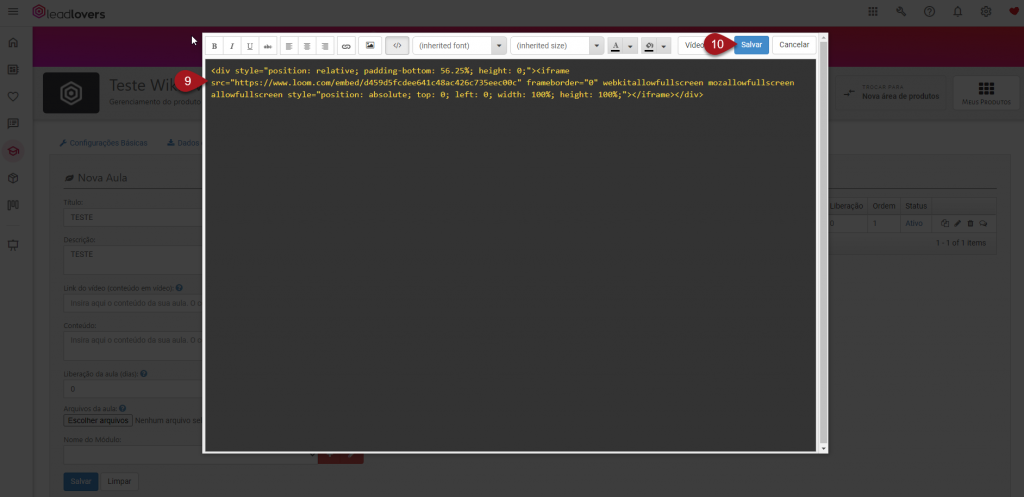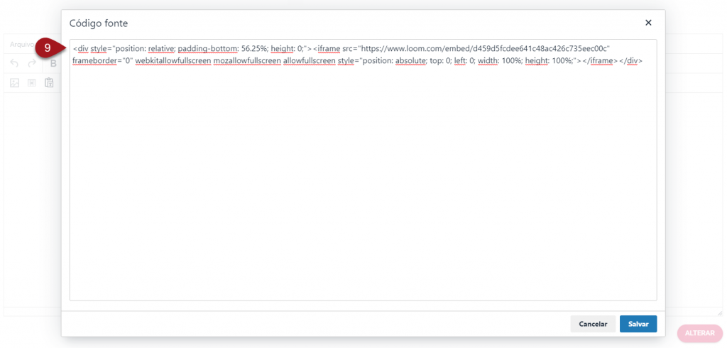 9 – Agora você irá inserir o código IFRAME do vídeo de sua plataforma externa.