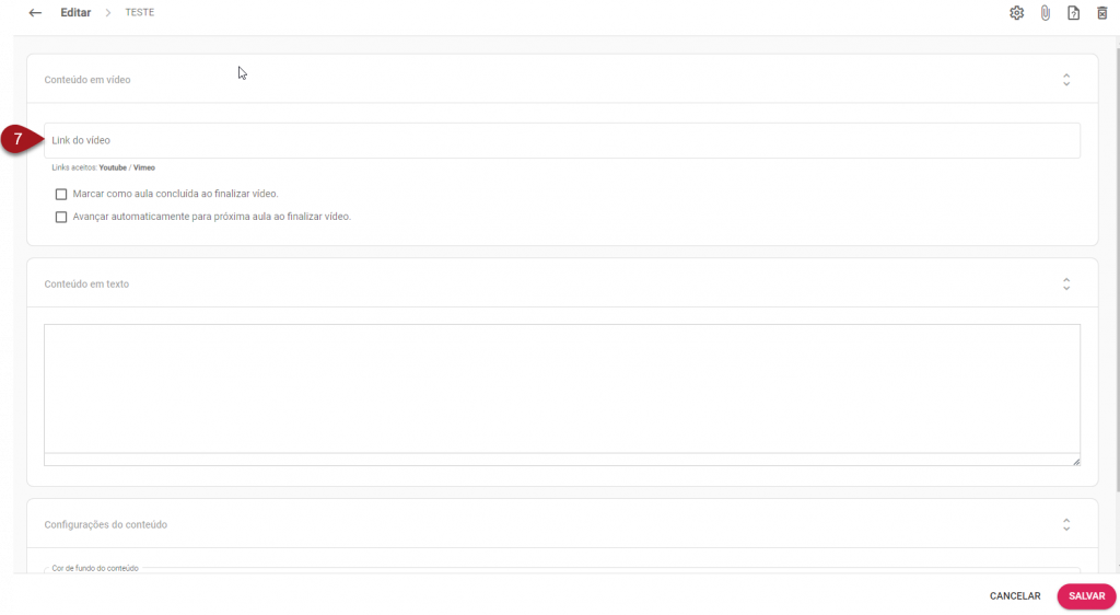 7 – Basta inserir o link completo do vídeo neste campo. Lembrando que aqui você irá inserir apenas o vídeo que estiver no Youtube ou Vimeo. Após realizar o procedimento, clique em Salvar.