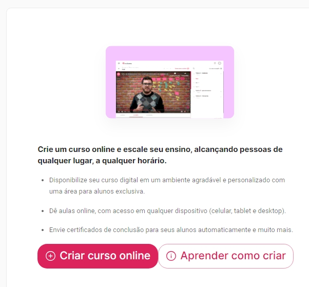Nº2– Se for a sua primeira vez, clique em criar curso, após isso defina um nome para o seu produto.