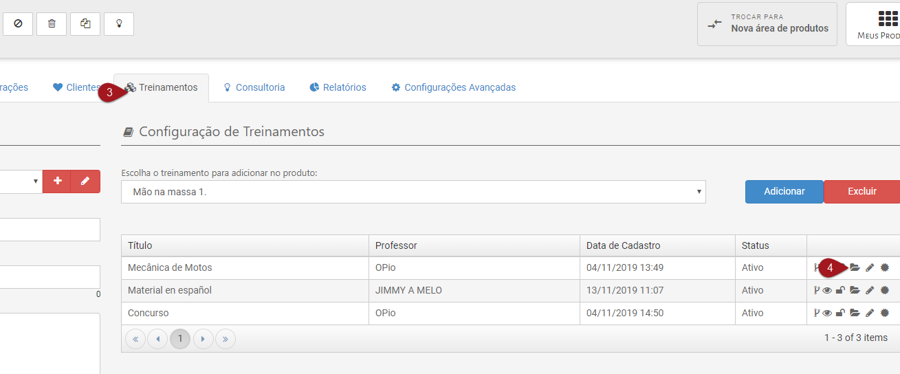 Nº 3 – No menu superior da máquina acesse a opção Treinamentos Nº 4 – Escolha o treinamento que vai criar a aula, clique no ícone de pasta ( opção Aulas ) e acesse dentro do treinamento.