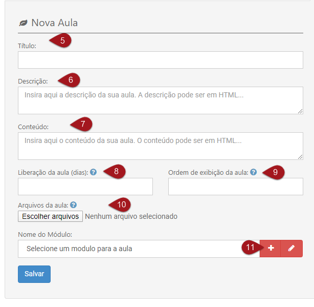 Nº 5 – Informe o Título que a aula terá. Nº 6 – Clique nesta caixa para adicionar a descrição/introdução sobre a aula. Nº 7 – Em conteúdo é aonde você irá adicionar informações como vídeos, links, etc… Obs: Temos um tutorial mostrando como inserir vídeos em aulas